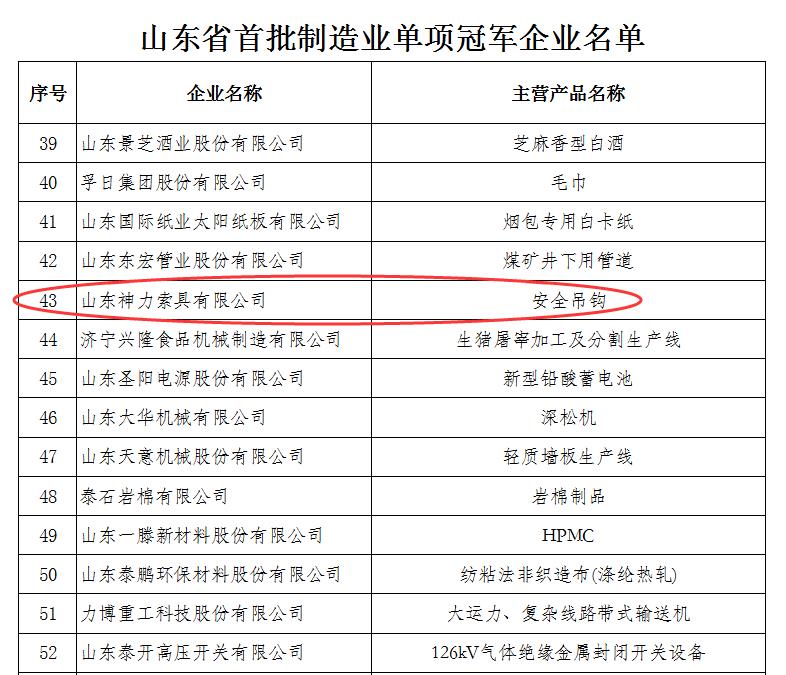 為貫徹落實《中國制造2025》,引導制造業企業專注于細分產品領域精耕細作,根據《山東省制造業單項冠軍企業培育提升專項行動實施方案》(魯經信產〔2017〕143號),經企業自主申報、各市經濟和信息化委及有關行業協會推薦、專家評審和網上公示等程序,確定了山東省首批制造業單項冠軍企業名單,現予公布。