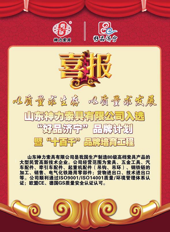 神力索具產(chǎn)品被機械電子工業(yè)部評定為優(yōu)質(zhì)產(chǎn)品,被國家經(jīng)貿(mào)委認定為國家級新產(chǎn)品,并榮獲“九五”國家技術創(chuàng)新優(yōu)秀項目獎、“最具市場競爭力品牌”、“中國索具行業(yè)50強企業(yè)”、“山東名牌”、“山東省著名商標”、“中國出口名牌”“山東省高新技術企業(yè)”“山東省索具工程技術中心”、“中國馳名商標”等稱號。神力索具先后榮獲全國輕工業(yè)系統(tǒng)先進集體、中國輕工業(yè)思想政治工作優(yōu)秀企業(yè)、中國專利山東明星企業(yè)、中國鍛壓協(xié)會工作先進單位、山東省“十五”期間機電產(chǎn)品出口先進企業(yè)、山東省現(xiàn)場管理樣板企業(yè)、山東省企業(yè)文化建設示范單位、山東省技術創(chuàng)新示范企業(yè)、山東省節(jié)能示范企業(yè)、山東省機械行業(yè)文明單位、山東省百強民營企業(yè)、連續(xù)三年濟寧百強民營企業(yè)等多項榮譽稱號。