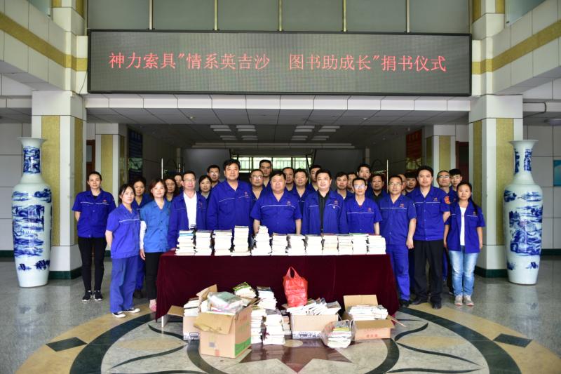 倡議一經發出,立即得到了廣大員工的積極響應,2019年5月11日,山東神力索具有限公司干部、職工在辦公樓一樓大廳舉辦“神力情系英吉沙 捐贈圖書助成長”捐書儀式,公司領導帶頭捐贈圖書,各部門職工踴躍前往捐書點,本次活動共捐各類書籍近1000冊,真可謂“愛心千里送真情,捐書萬卷育英才”。整個捐書活動現場莊重而溫馨,讓我們真切感受到了中華民族大家庭的溫暖!我們神力人用實際行動傳承和弘揚幫貧扶困、助人為樂、奉獻愛心的中華傳統美德,以此表達對祖國花朵成長的拳拳關愛之情!